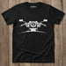 Black t-shirt with size guide on a white background